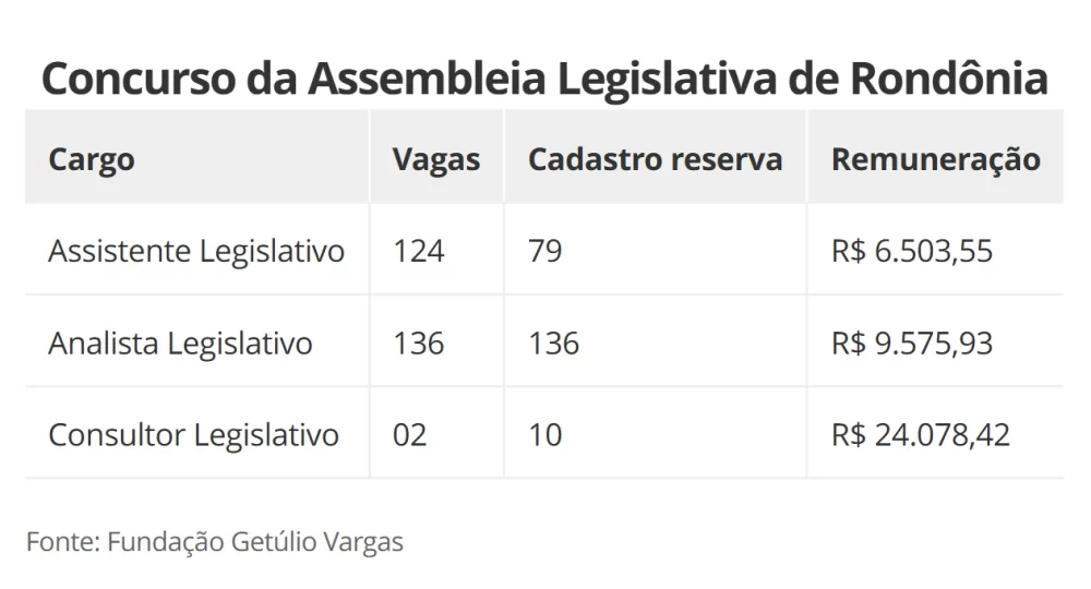 A Assembleia Legislativa de Rondônia (ALE-RO) anunciou nesta terça-feira (23) que o edital do novo concurso público será lançado até o final de outubro. O certame vai oferecer mais de 200 vagas, com salários de até R$ 24 mil.