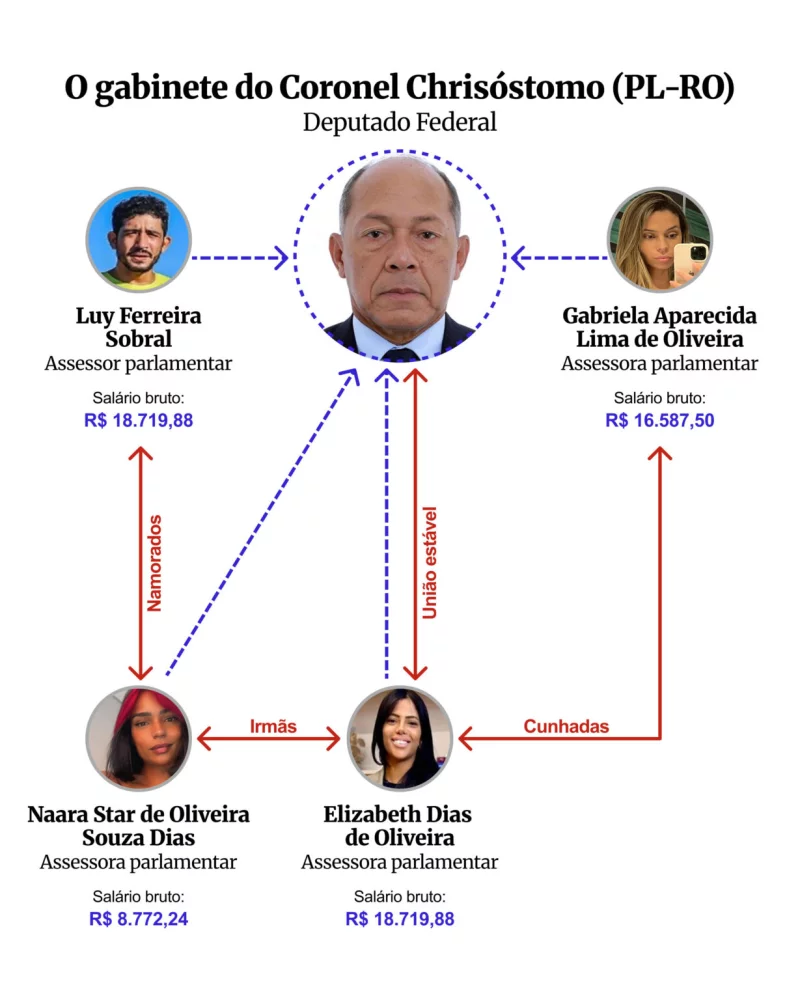 A companheira do deputado também levou a irmã, Naara Star de Oliveira Souza Dias, para o gabinete em julho de 2022. Aos 25 anos, Naara acumulou R$ 386,5 mil em remunerações, exercendo um Cargo de Natureza Especial (CNE) — que exige frequência presencial na Câmara — com salário bruto de R$ 8.772,24.