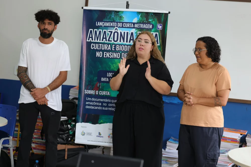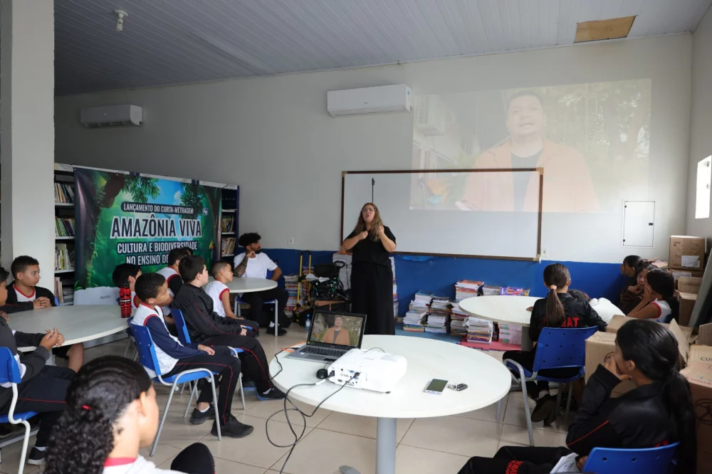 O curta-metragem “Amazônia Viva: Cultura e Biodiversidade no Ensino de Vilhena” foi lançado na Escola Municipal Almirante Tamandaré, localizada no bairro Cristo Rei, em Vilhena (RO), na quinta-feira, 24 de abril. A obra, que tem 10 minutos de duração, classificação livre e conta com interpretação em Libras, foi exibida gratuitamente para os alunos, seguida de uma roda de conversa sobre biodiversidade e cultura regional.