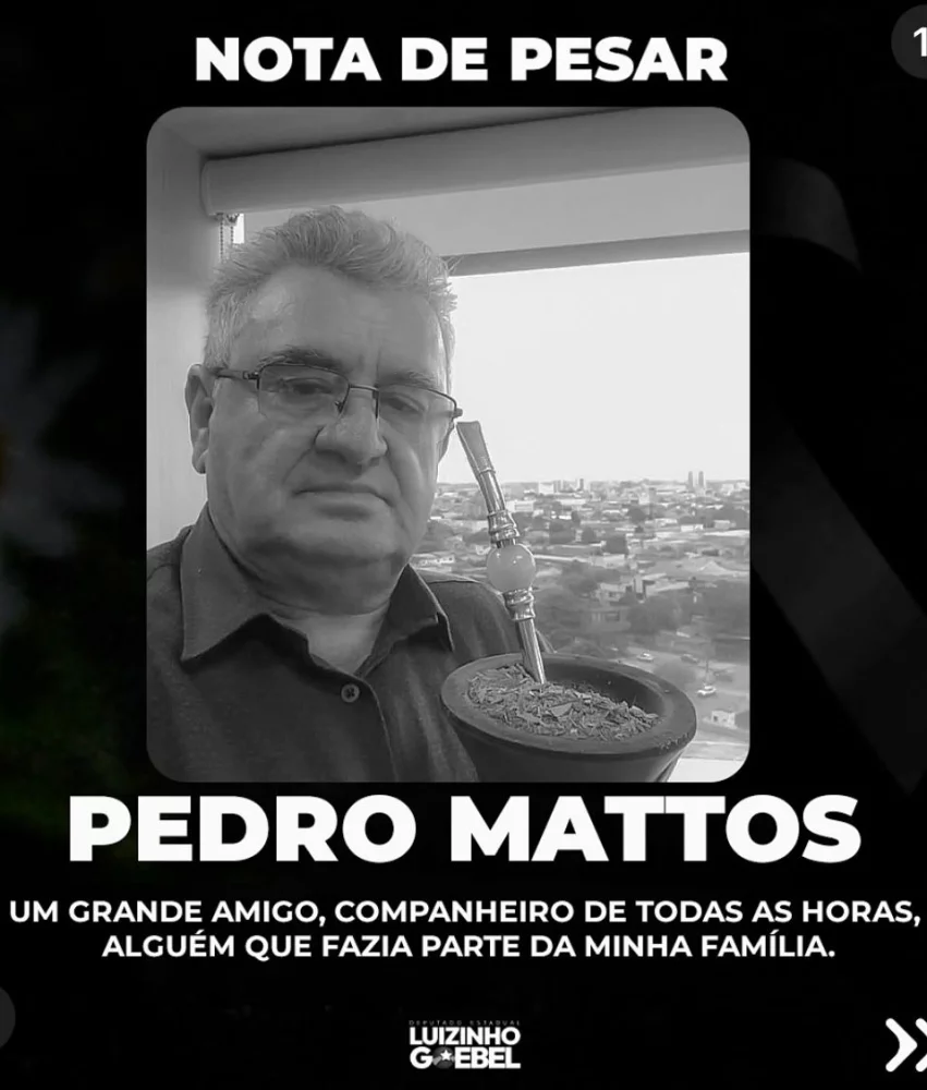 O deputado estadual Luizinho Goebel (PODEMOS) lamentou, com profunda tristeza, o falecimento de Pedro Roberto Mattos, ocorrido em um acidente próximo a Porto Velho. Pedro era irmão do chefe de gabinete do parlamentar e considerado por Luizinho como um amigo muito próximo, quase parte de sua própria família.