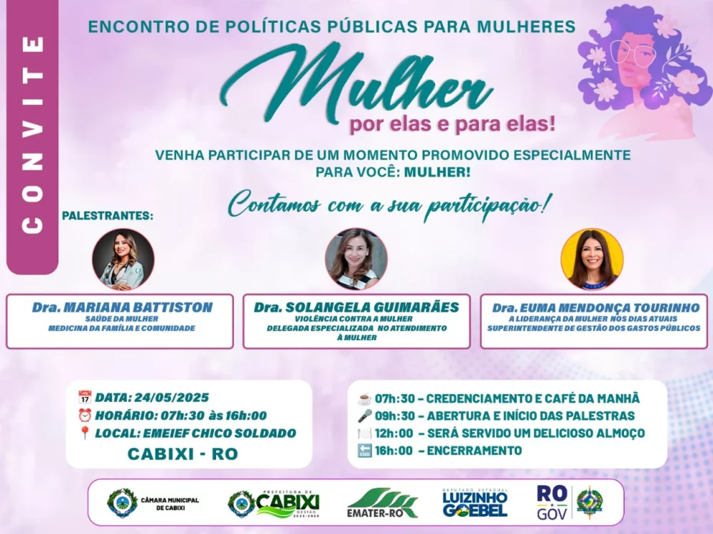 Com o tema “Mulher: por elas e para elas”, o Encontro de Políticas Públicas para Mulheres será realizado no próximo dia 24 de maio de 2025, na Escola Municipal EMEIEF Chico Soldado, em Cabixi, das 07h30 às 16h00. O evento conta com o apoio do deputado estadual Luizinho Goebel (PODEMOS) e tem como objetivo promover conhecimento, saúde, bem-estar e valorização das mulheres da região.