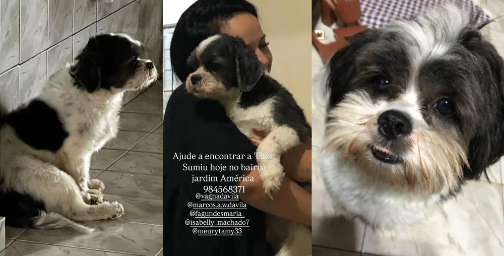 Thor, que aparece na imagem sendo segurada por uma tutora, é de pequeno porte, com pelagem preta e branca. Segundo relatos, ela é dócil e bastante apegada à família.