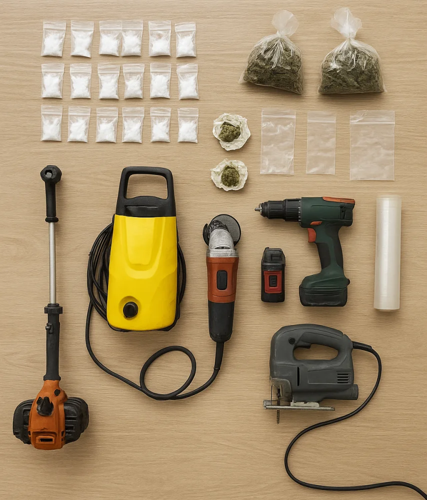 No mesmo cômodo, os policiais localizaram diversas ferramentas sem comprovação de origem lícita, entre elas roçadeira, lavadora de alta pressão, serra mármore, parafusadeira, nível a laser, furadeira, esmerilhadeira e rolos de fios elétricos. Questionado, o suspeito negou ser dono das drogas e afirmou que pertenceriam a outro morador, sem informar quem seria. A companheira também disse ter recebido os equipamentos de terceiros, sem apresentação de notas fiscais, o que caracterizou indícios de receptação, prevista no artigo 180 do Código Penal.