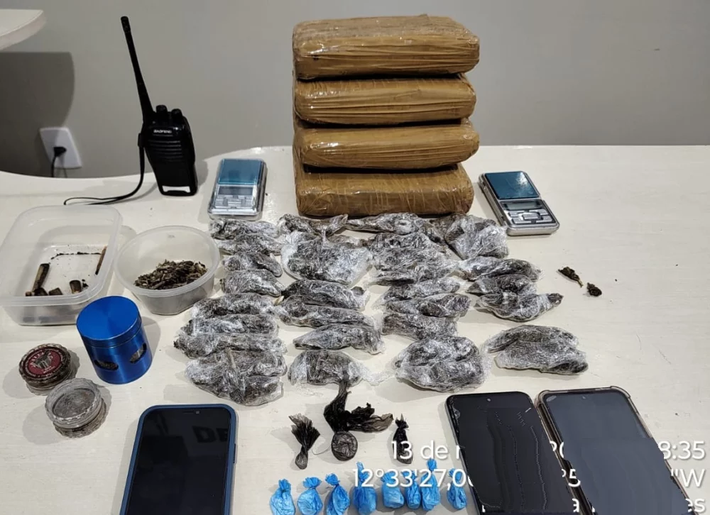 Durante buscas no imóvel, os militares localizaram duas balanças de precisão, uma garrafa térmica contendo várias porções de maconha prontas para venda, além de um rádio comunicador com base de carregamento. No quintal da residência, enterrada sob uma caixa d’água, foi encontrada uma sacola com quatro tabletes de maconha.