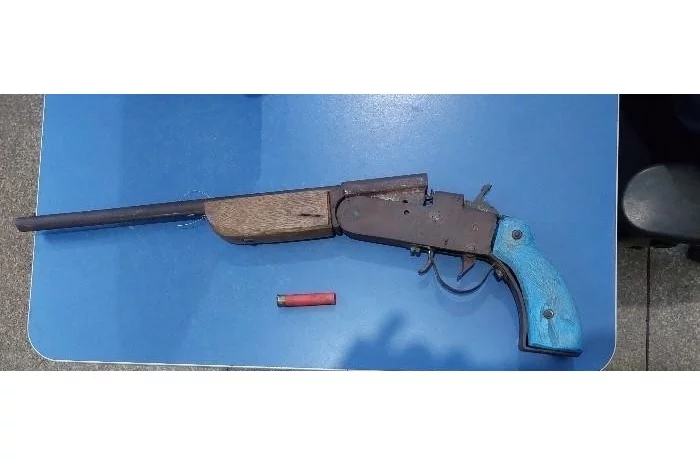 Durante as buscas no imóvel, os militares encontraram, escondida dentro de um colchão, uma garrucha artesanal de cabo azul, calibre .36, carregada com um cartucho intacto.