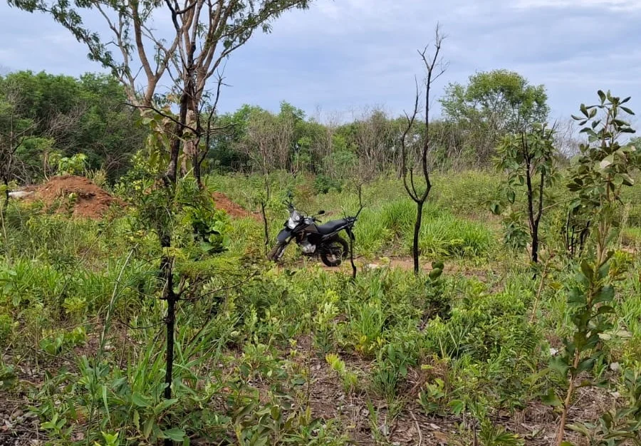 Com base em levantamentos e mapeamento de possíveis rotas de fuga, a equipe identificou uma área de mata utilizada com frequência como ponto de esconderijo para motocicletas furtadas. No local, os investigadores localizaram a Honda Bros parcialmente encoberta pela vegetação, indicando que o responsável pretendia retornar para buscá-la.
