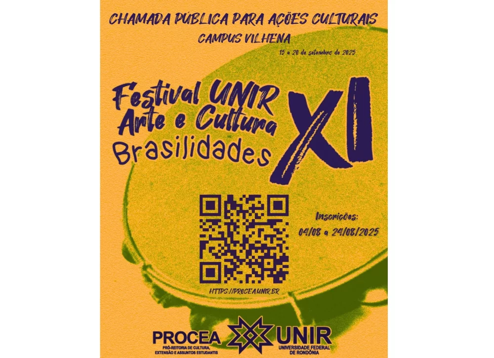 A Universidade Federal de Rondônia (UNIR) – Campus Vilhena, por meio da Pró-Reitoria de Cultura, Extensão e Assuntos Estudantis (PROCEA), está com inscrições abertas para o XI Festival UNIR Arte e Cultura, que este ano tem como tema “Brasilidades”. O evento será realizado entre os dias 15 e 20 de setembro de 2025 e reunirá apresentações e atividades culturais que valorizam a diversidade artística brasileira.