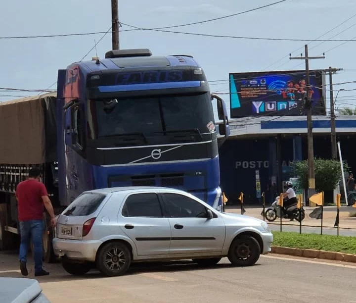Vídeo mostra carreta arrastando Celta após colisão em avenida de Vilhena
